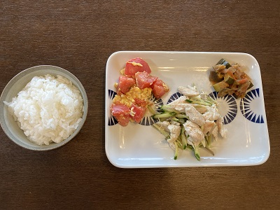 メインがちょっと貧弱なので、パピオの実家からもらったトマトと卵の炒め物と、ラタトゥイユの副菜を用意しました。
